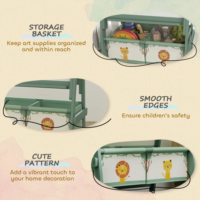 Onder het bord bevinden zich twee handige opbergmanden, waarin krijt, stiften en papier netjes opgeborgen kunnen worden. Alles binnen handbereik, zodat creativiteit nooit onderbroken hoeft te worden.